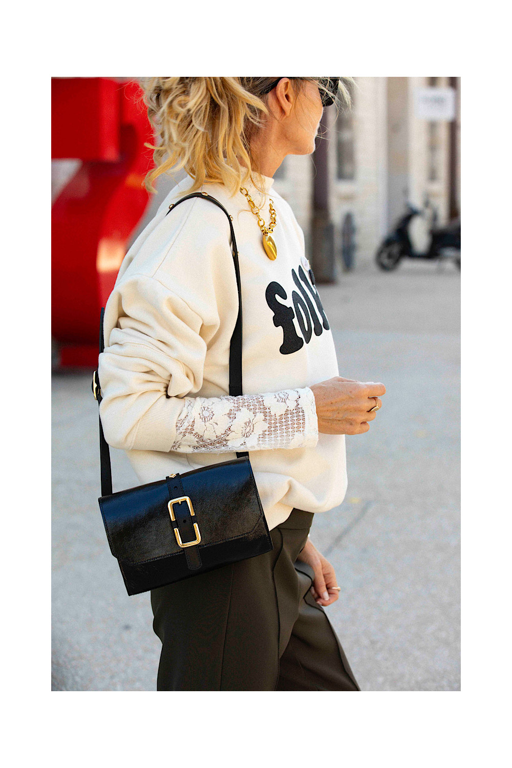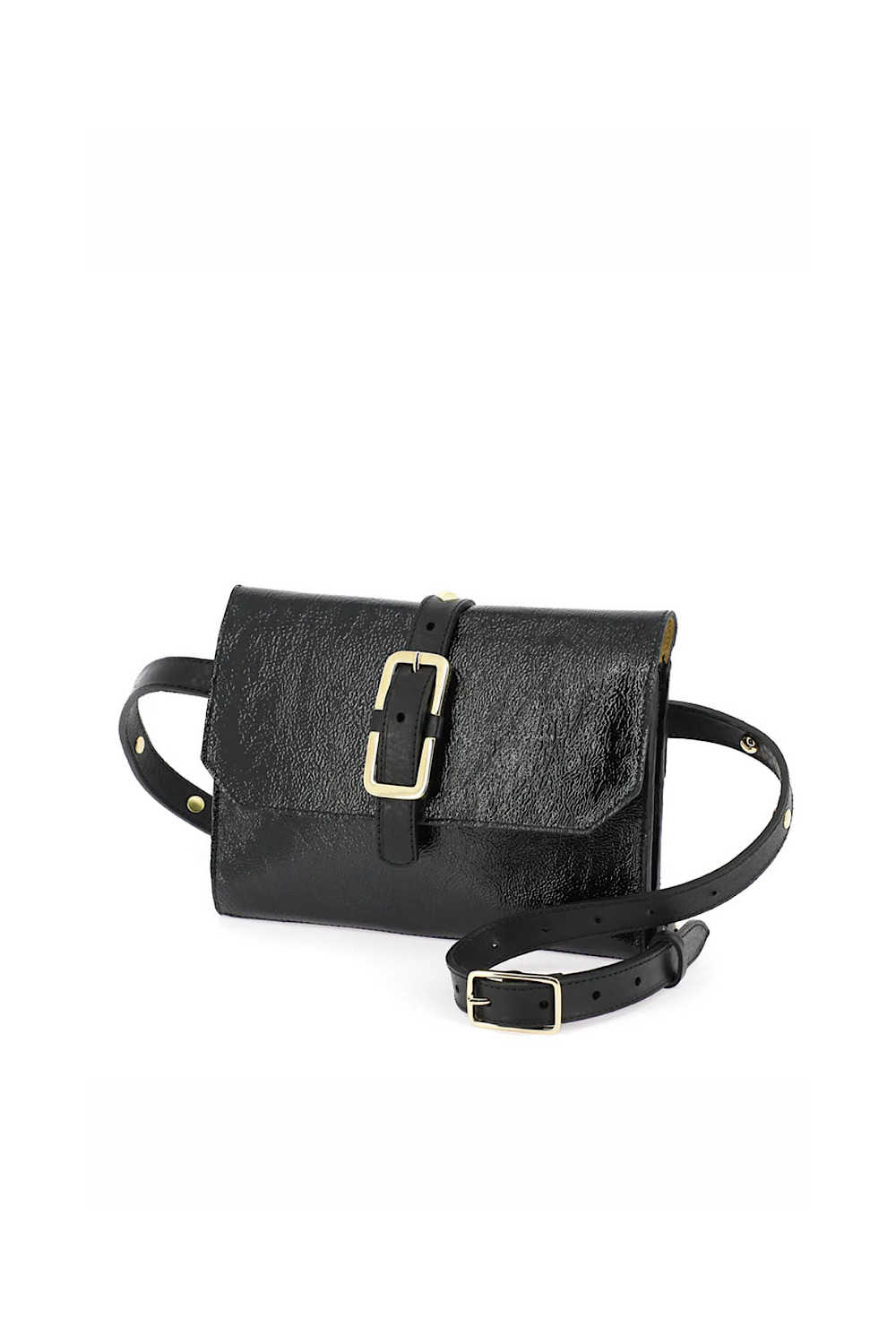 Caractéristiques : Pochette banane, portée croisée en bandoulière ou ceinturée à la taille, Cuir de vachette vernis Crispy Noir, Anse ajustable de 120 cm en cuir de vachette pleine fleur Noir au tannage végétal avec clous dorés sur toute la longueur, Intérieur organisé en quatre compartiments à la manière d’un compagnon, Doublure intérieure en croûte de cuir velours, Rabat avec bouton pression aimanté et boucle Millau, Bijouterie dorée, Fabriquée dans notre atelier familial à Hammamet (Tunisie)