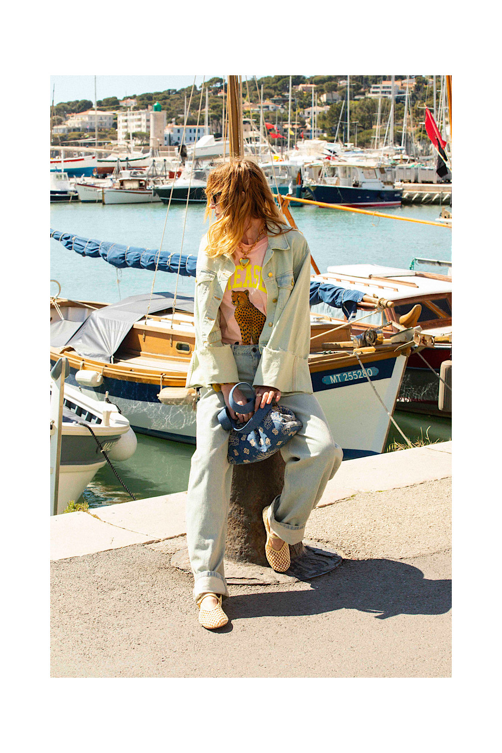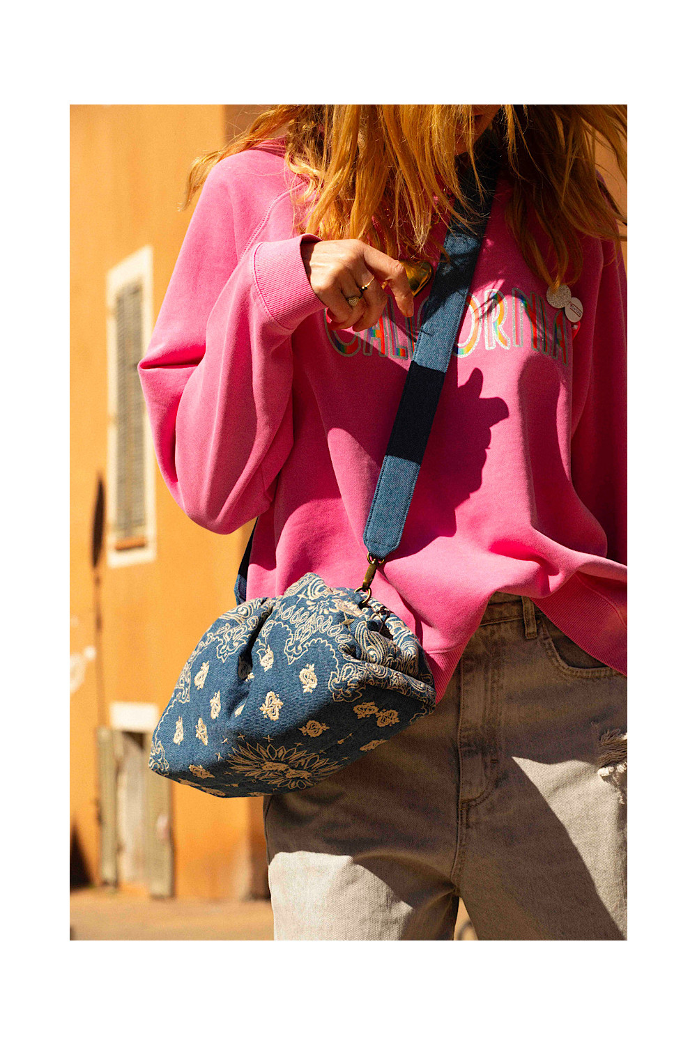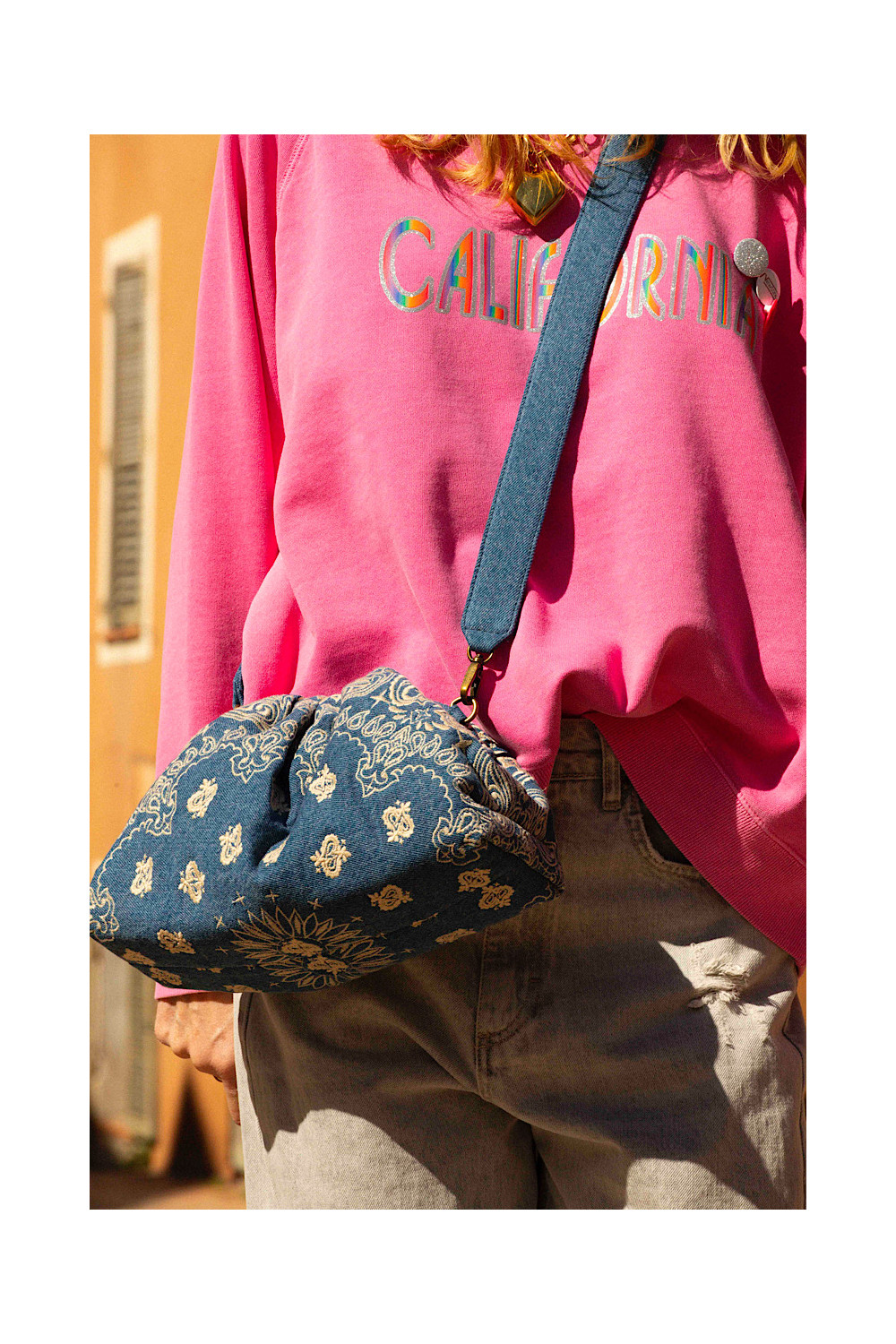 Doublure intérieure en coton et fermeture magnétique. Bandoulière amovible en denim.