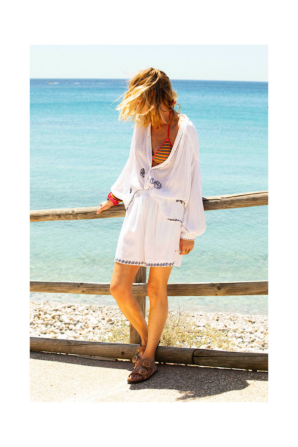 Caractéristiques : short blanc, élastique à la taille, broderie bleu en forme de vagues, short matière légère et fluide