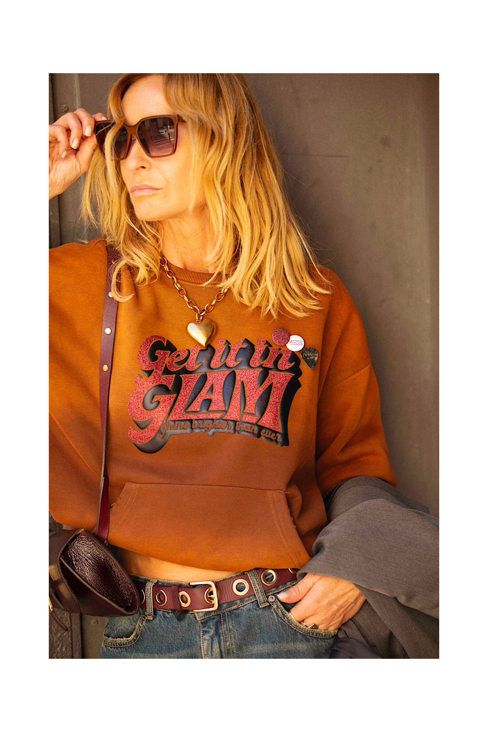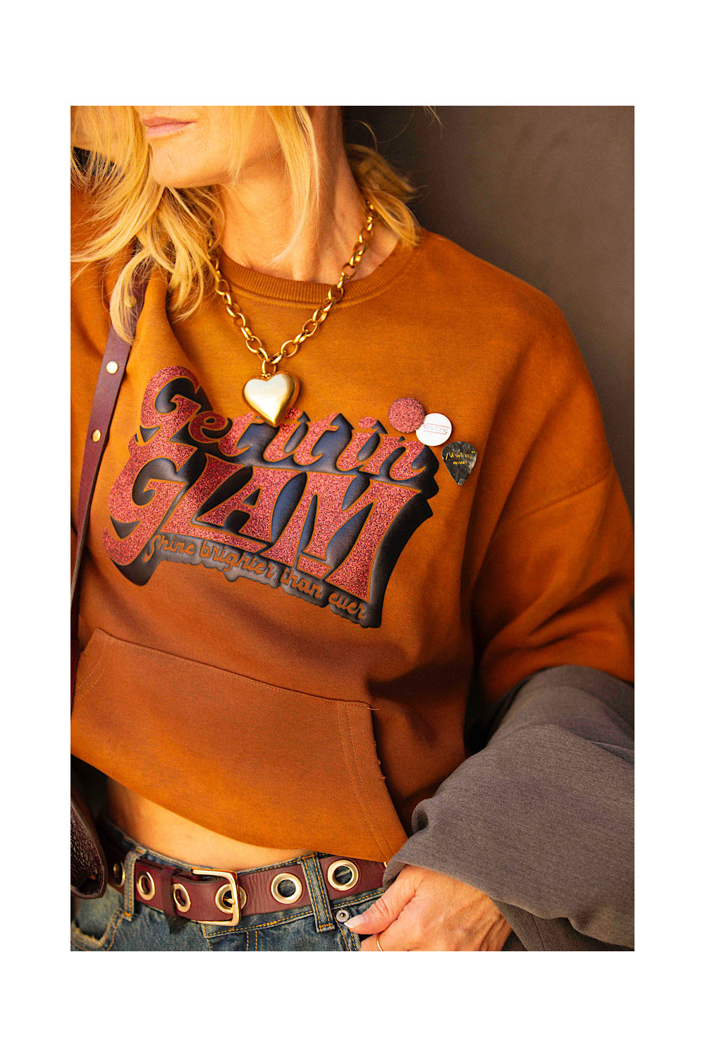 Caractéristiques : sweatshirt doux lavé, coloration tie & dye - délavée, col ras du cou avec une finition en côte, col, manches et bas avec des usures, manches longues avec finitions côtelées aux poignets, imprimé pailleté, deux badges coté cœur.