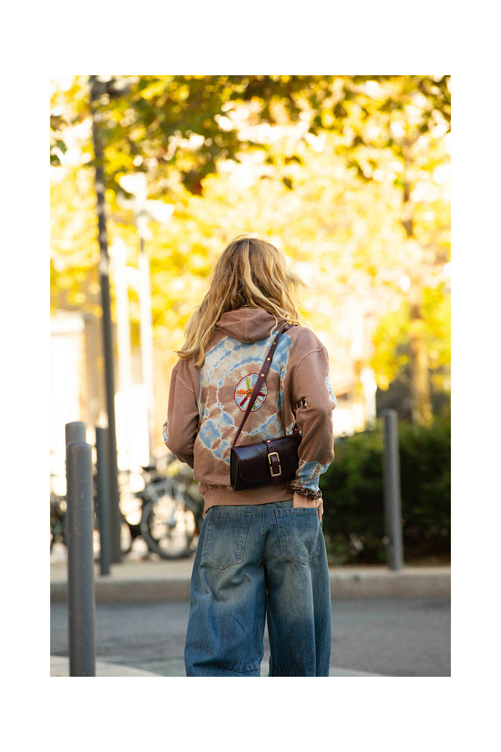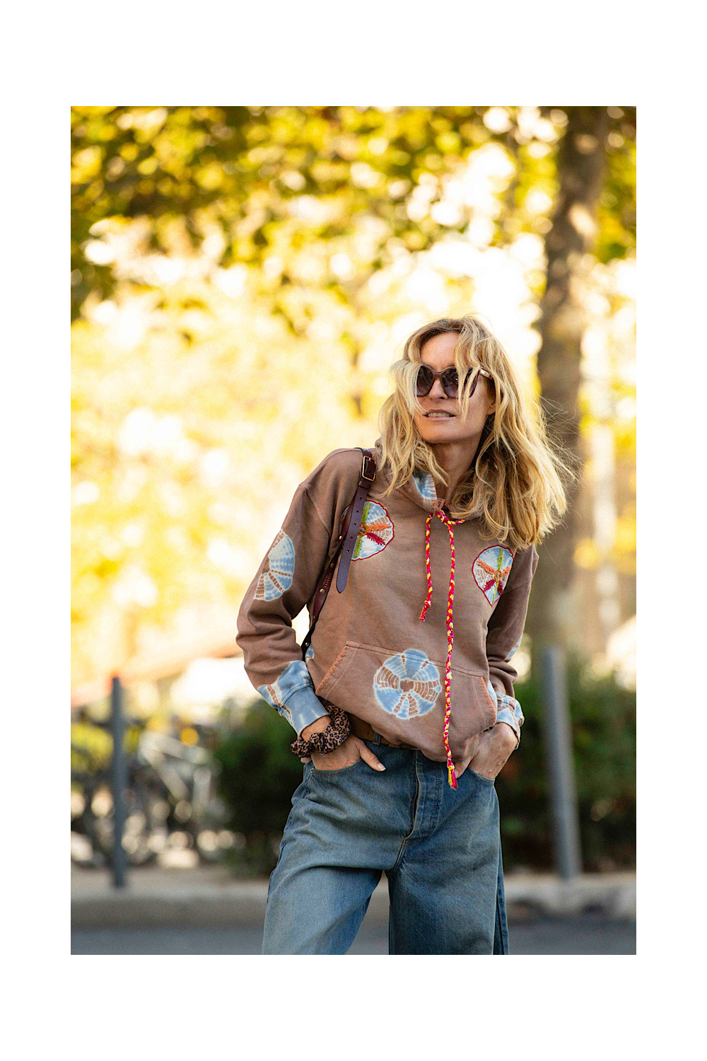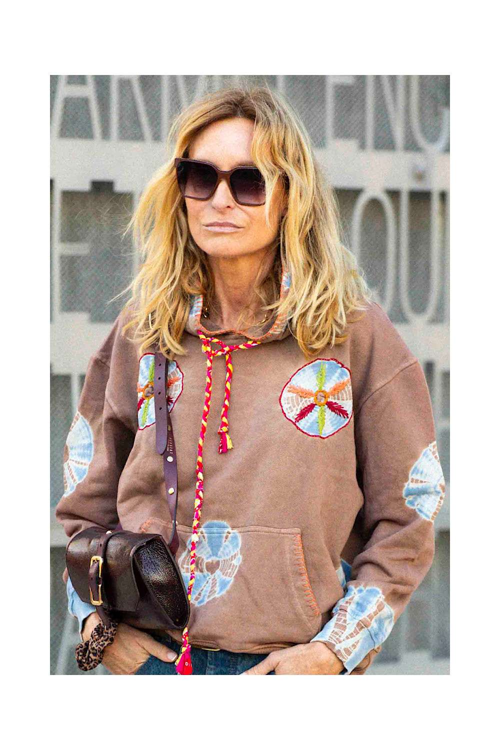 Caractéristiques : sweat à capuche, manches longues, tye & dye marron délavé, touche de bleu, poche devant brodé orange, broderies colorées, lacet à capuche tressée jaune, rouge et rose bandana.