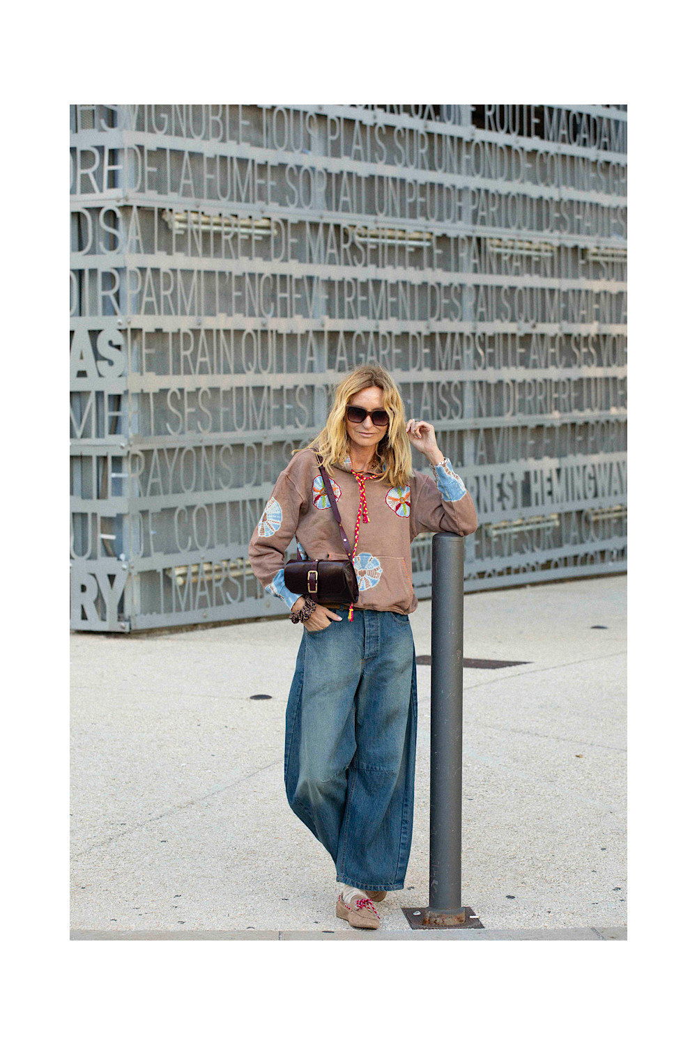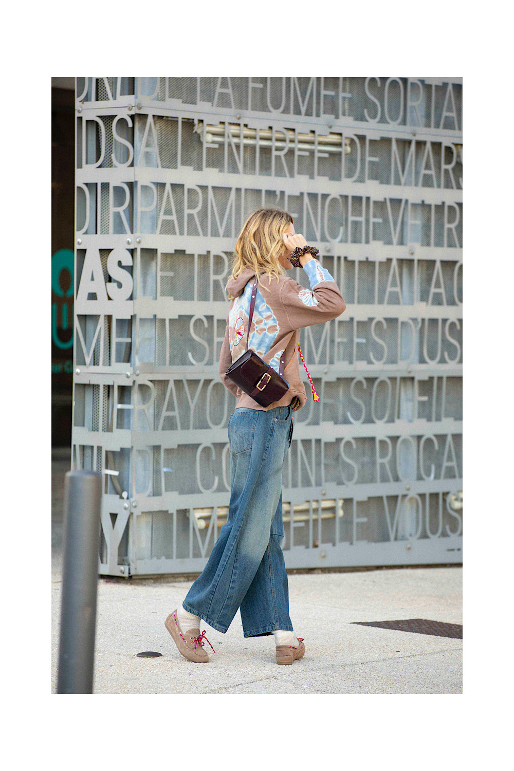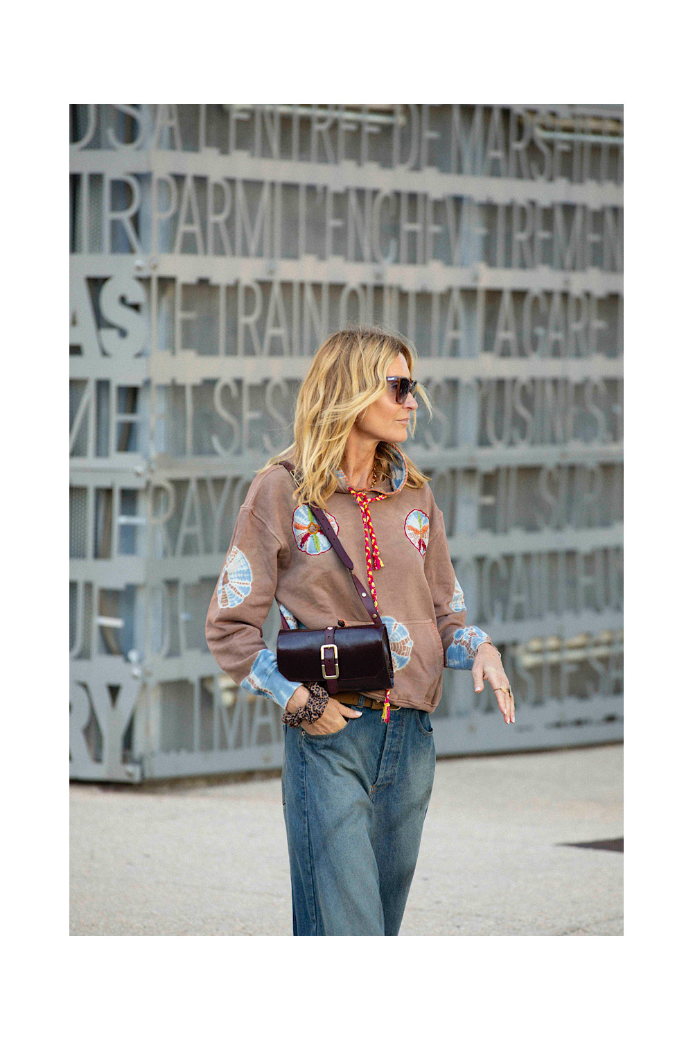 Caractéristiques : sweat à capuche, manches longues, tye & dye marron délavé, touche de bleu, poche devant brodé orange, broderies colorées, lacet à capuche tressée jaune, rouge et rose bandana.
