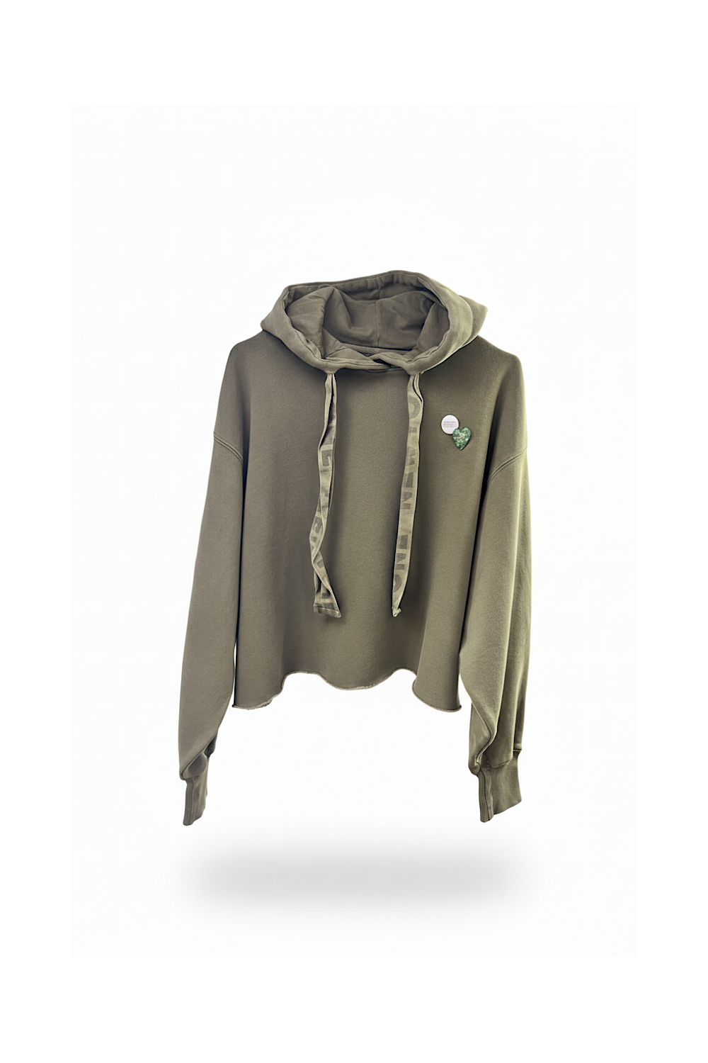 Caractéristique : capuche, coupe oversize, finition bord franc, resserrés aux poignets, lien de serrage au niveau de la capuche, 2 badges côté coeur
