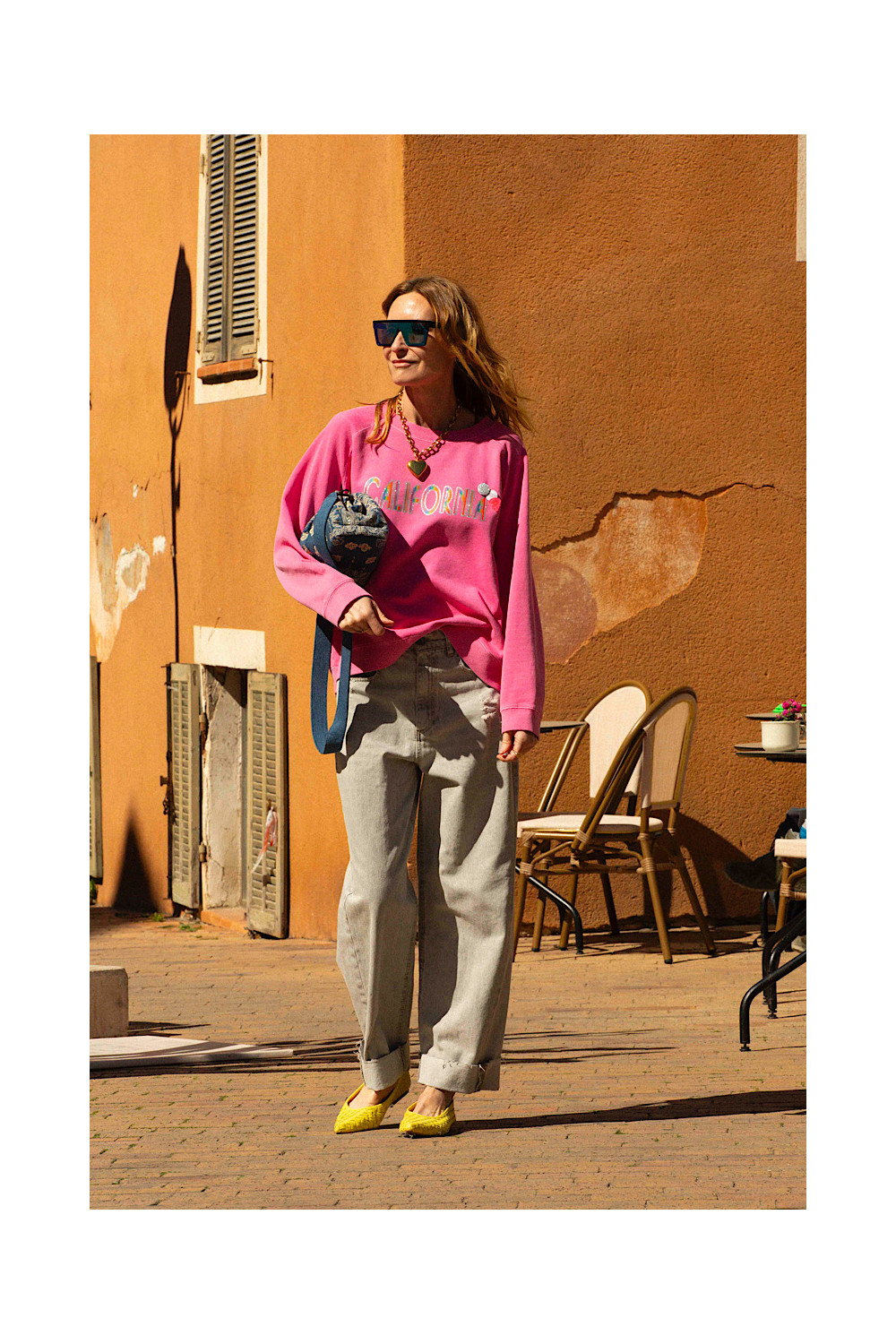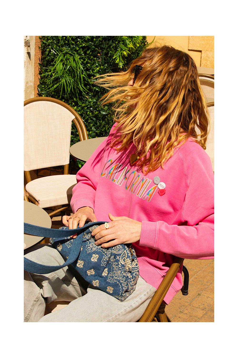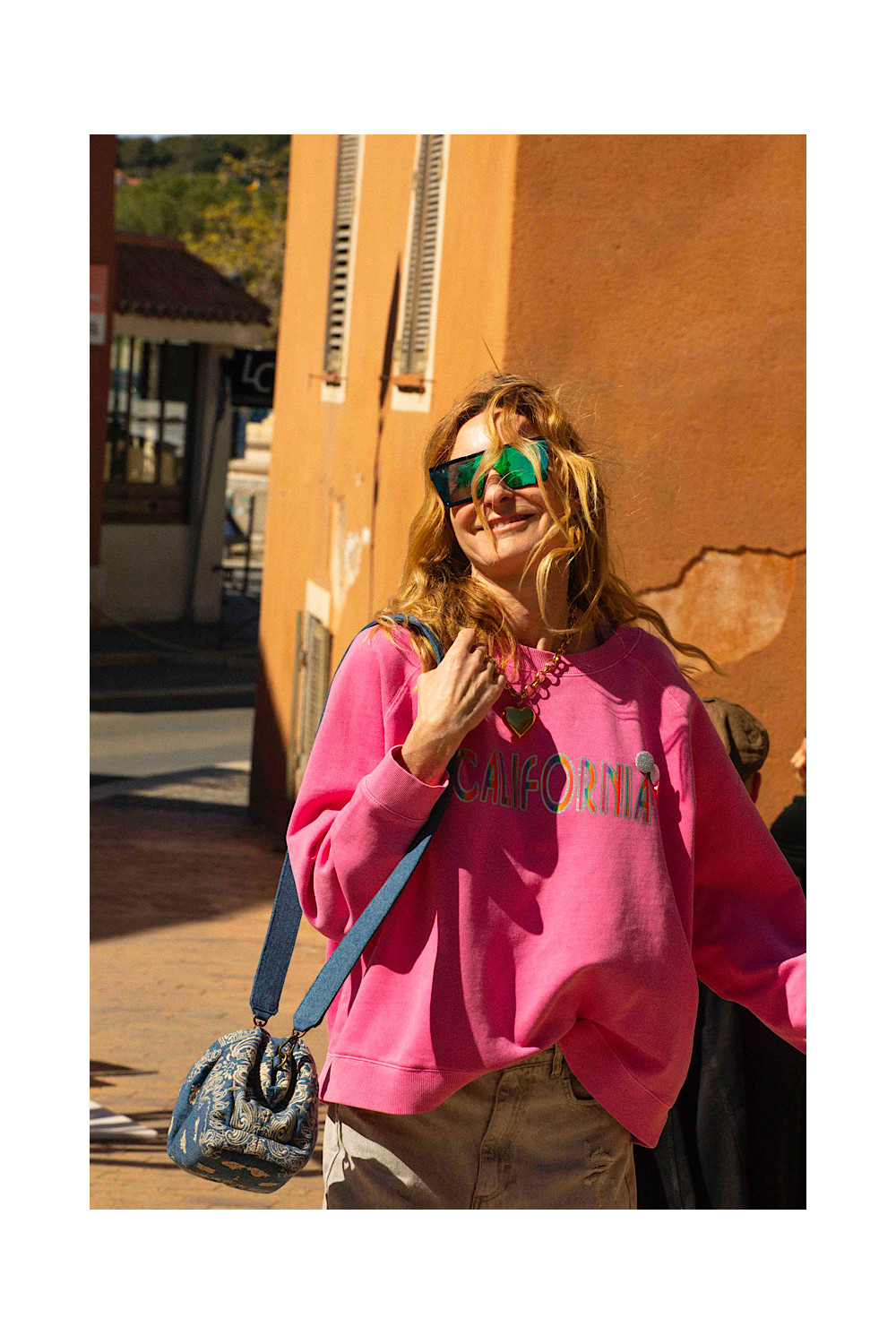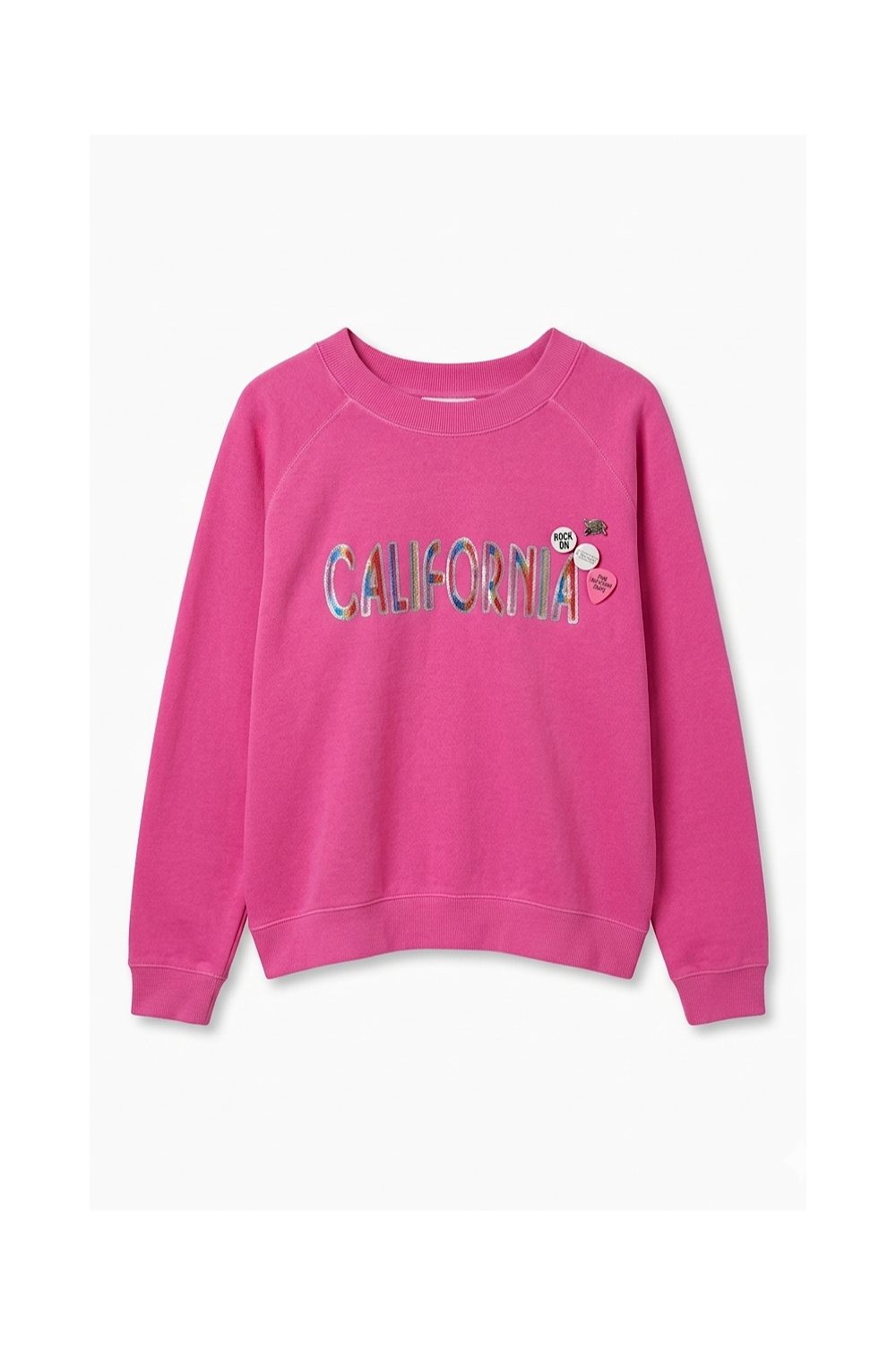 Sweatshirt Egger couleur fuschia avec flocage California en paillettes.