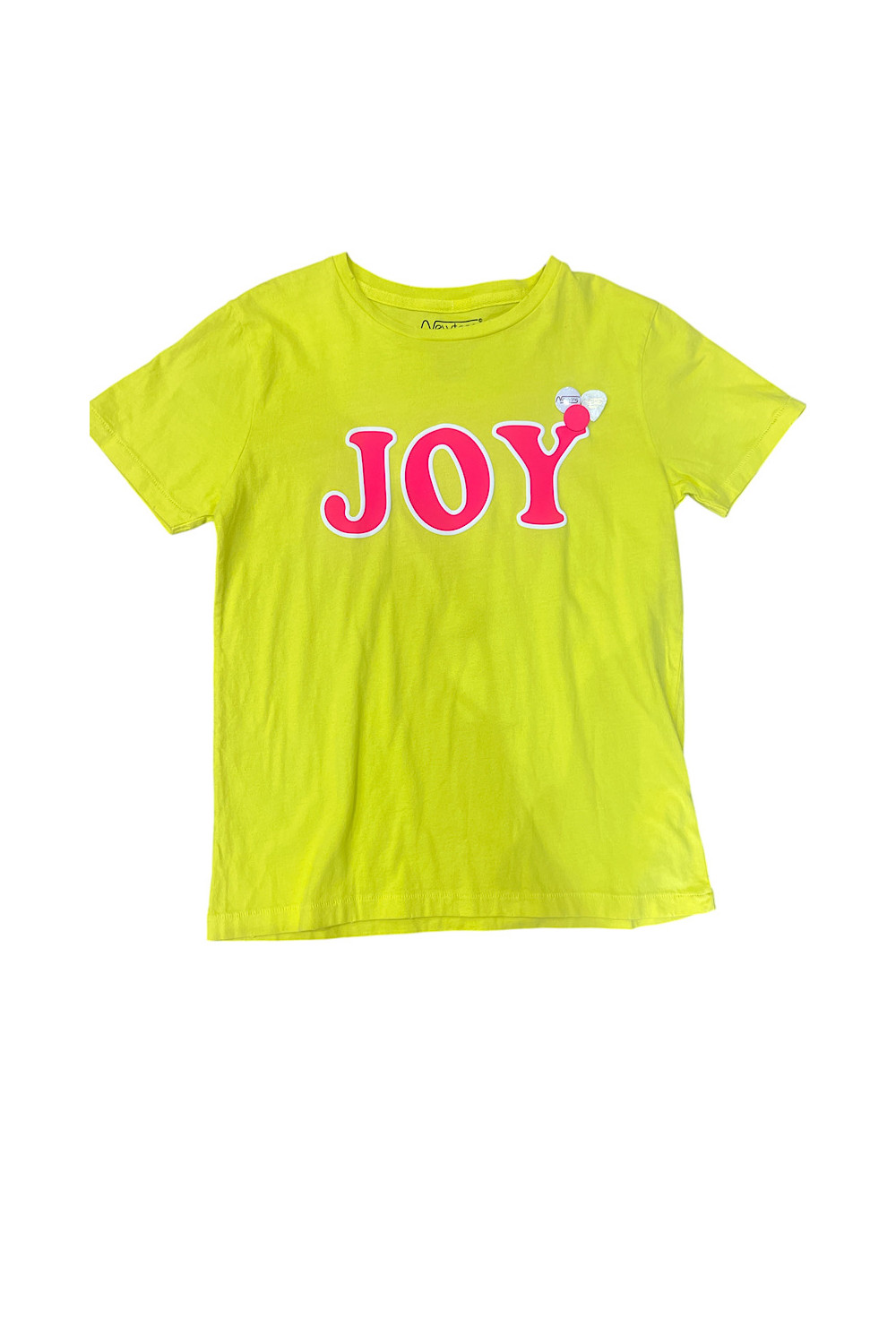 Caractéristiques : tshirt manches courtes de couleur jaune vif, col rond, coupe décontractée, effet used. Texte "JOY" imprimé en lettres majuscules rose avec un contour blanc, badges.
