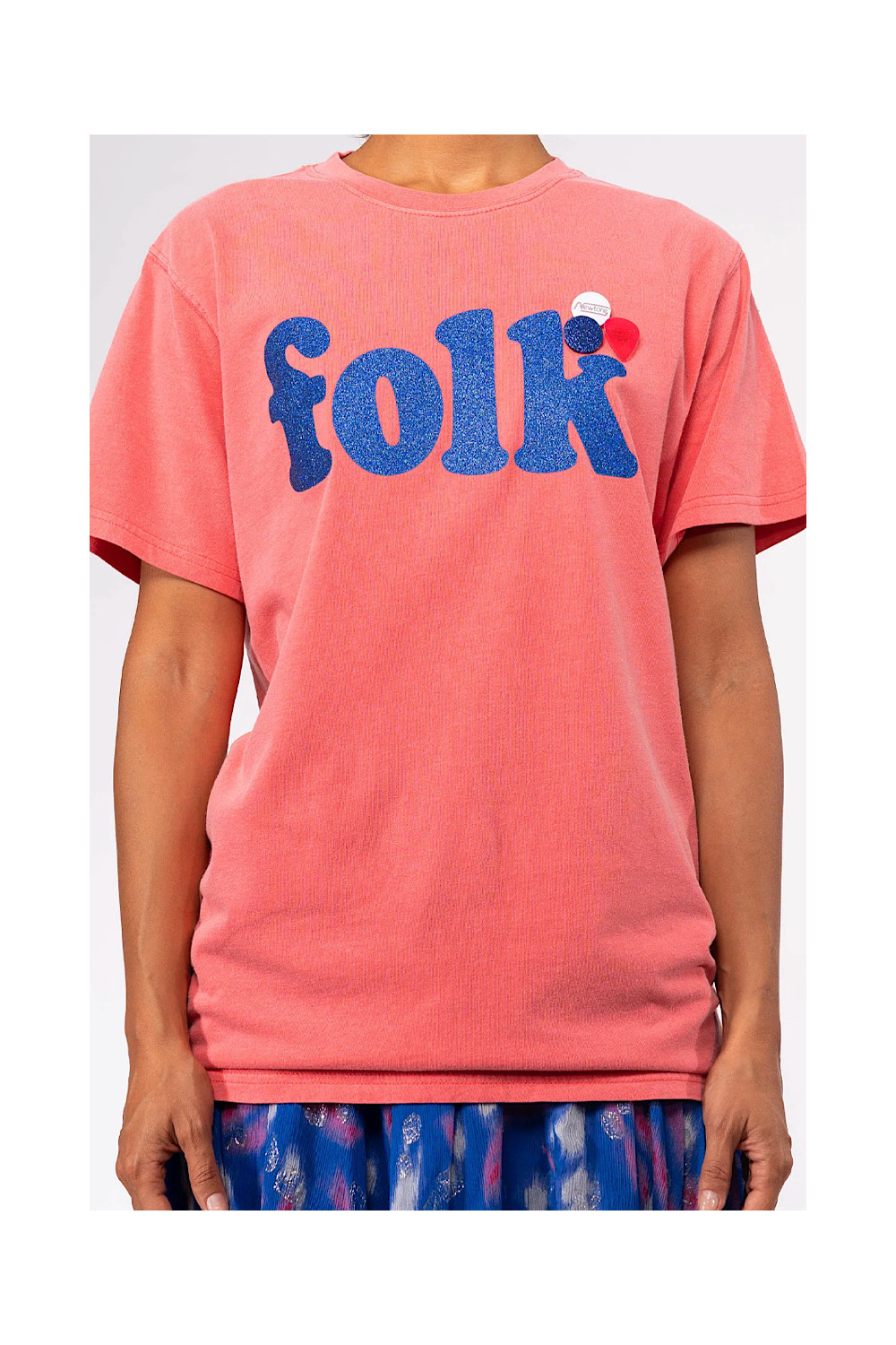 Caractéristiques : tossu doux lavé, manches courtes, col rond, imprimé pailleté bleu, tshirt couleur pêche, 2 badges et un médiator côté coeur.