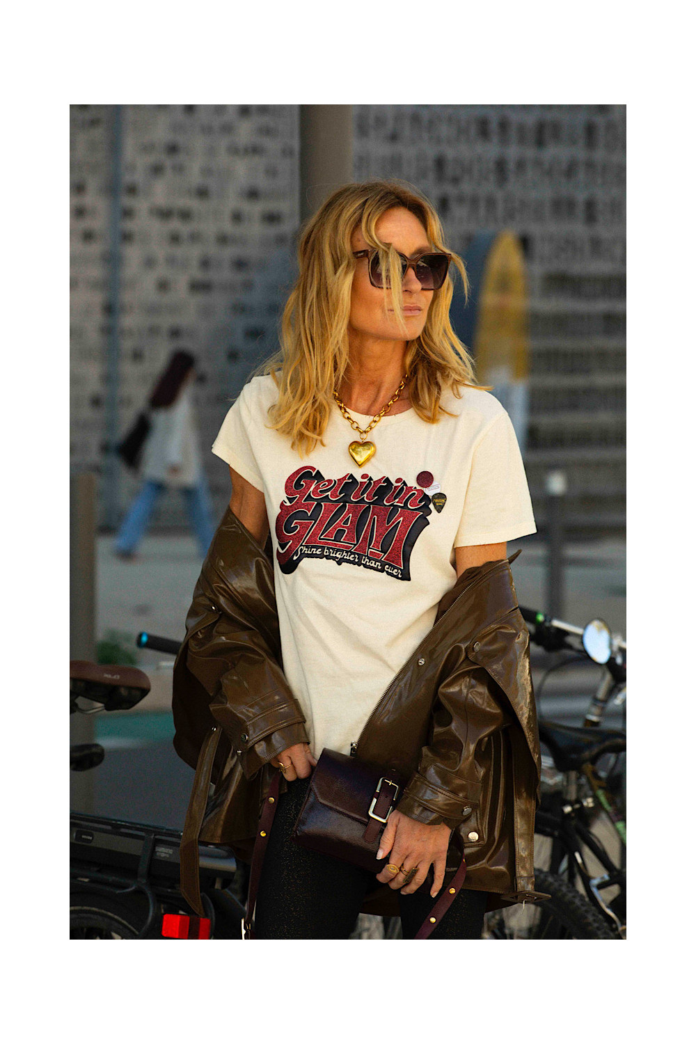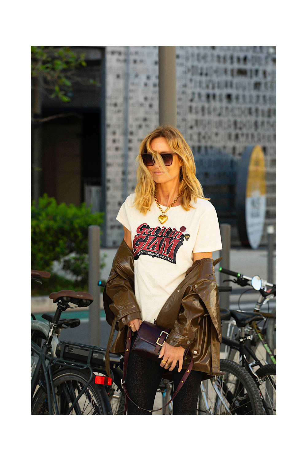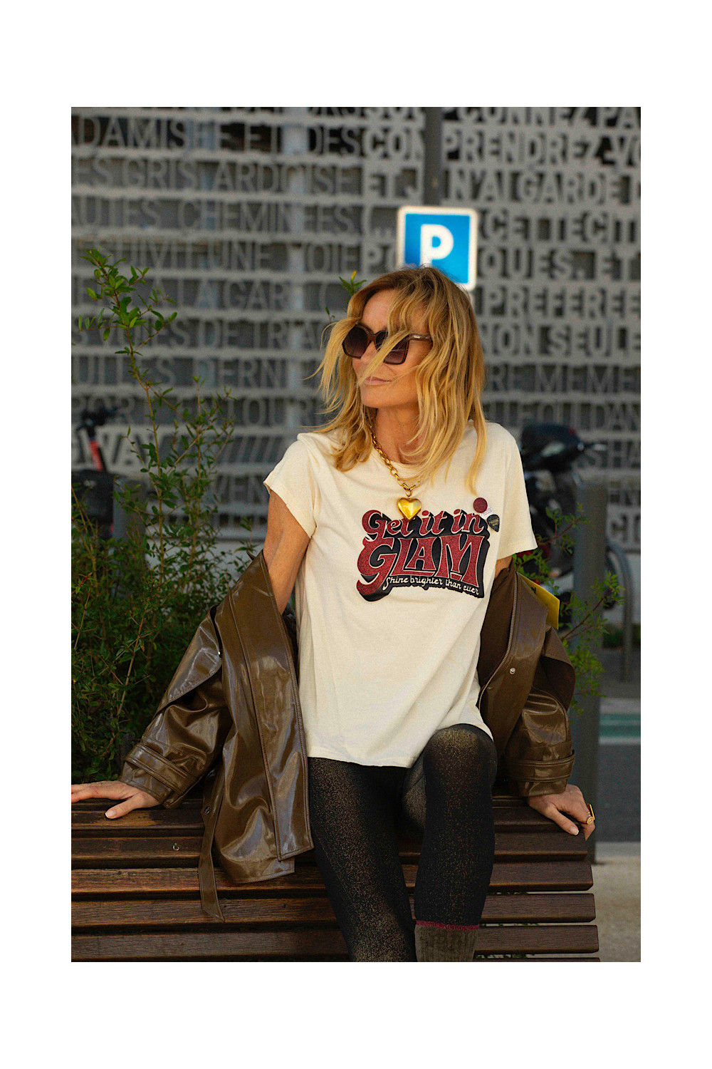 Caractéristiques : tissu doux lavé, col, manches et bas avec des usures, manches courtes, col rond, imprimé pailleté, 2 badges et un médiator côté coeur.