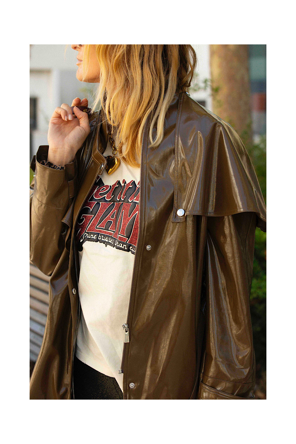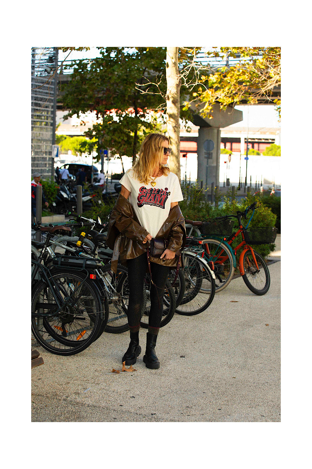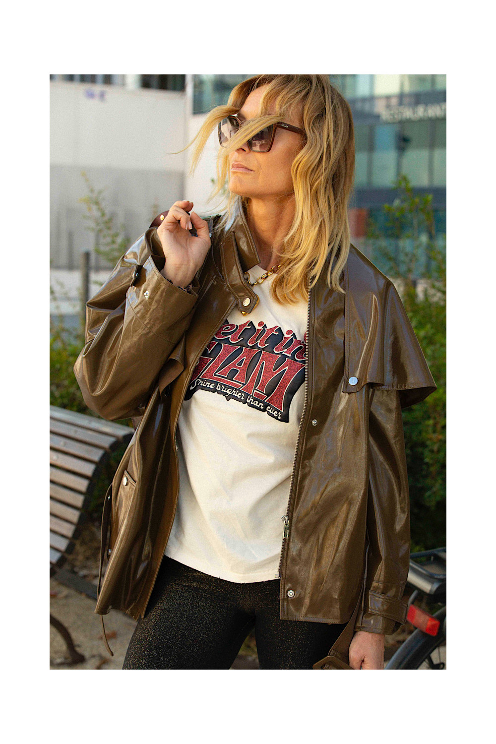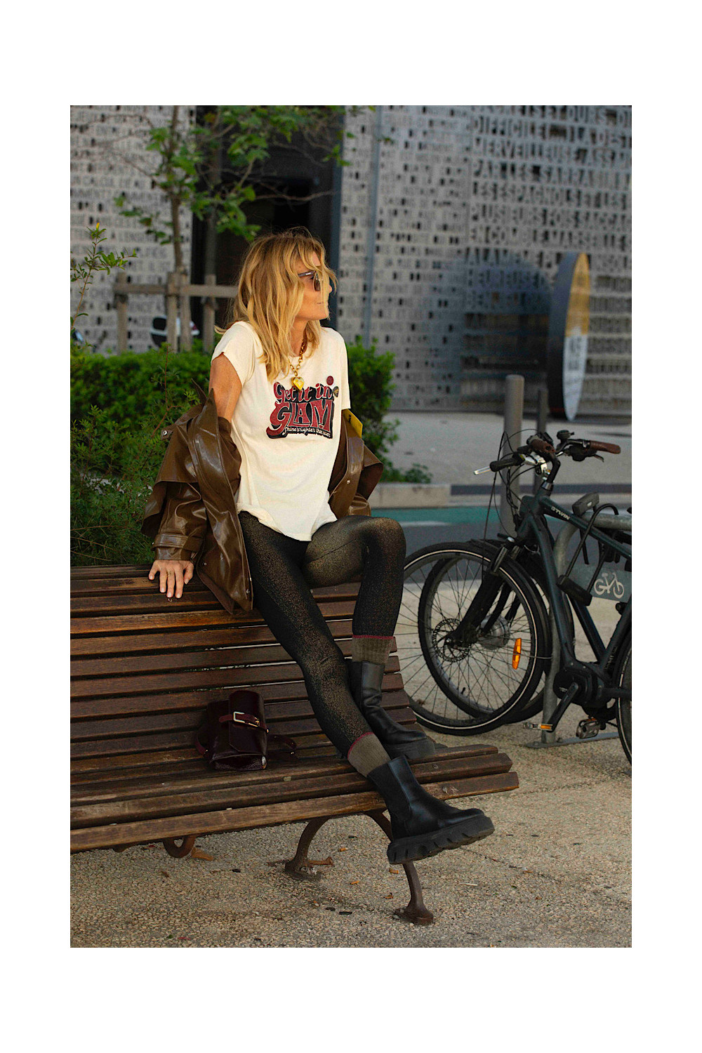 Caractéristiques : tissu doux lavé, col, manches et bas avec des usures, manches courtes, col rond, imprimé pailleté, 2 badges et un médiator côté coeur.