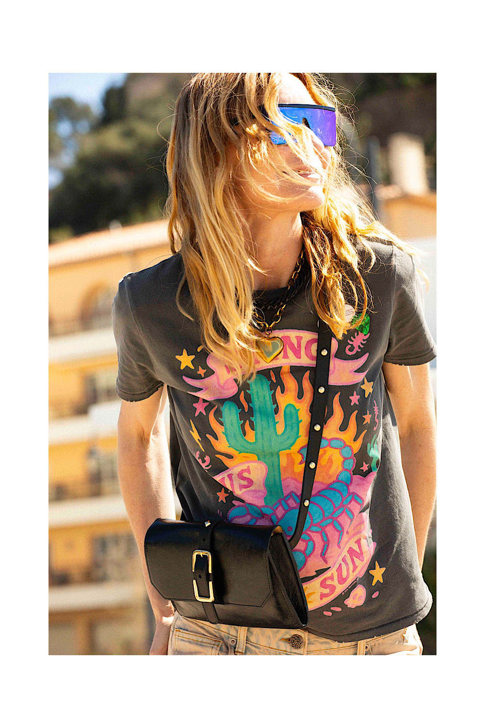Caractéristiques : tissu lavé, col, manches et bas avec des usures, manches courtes, col rond, imprimé pailleté, 2 badges et un médiator côté coeur