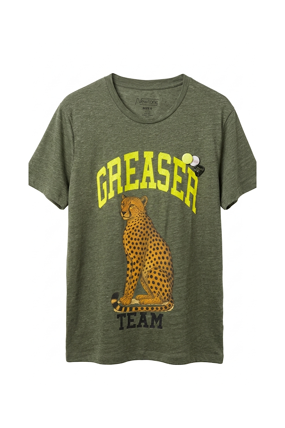 Couleur kaki avec imprimé panthère. Badges newtone Brand.