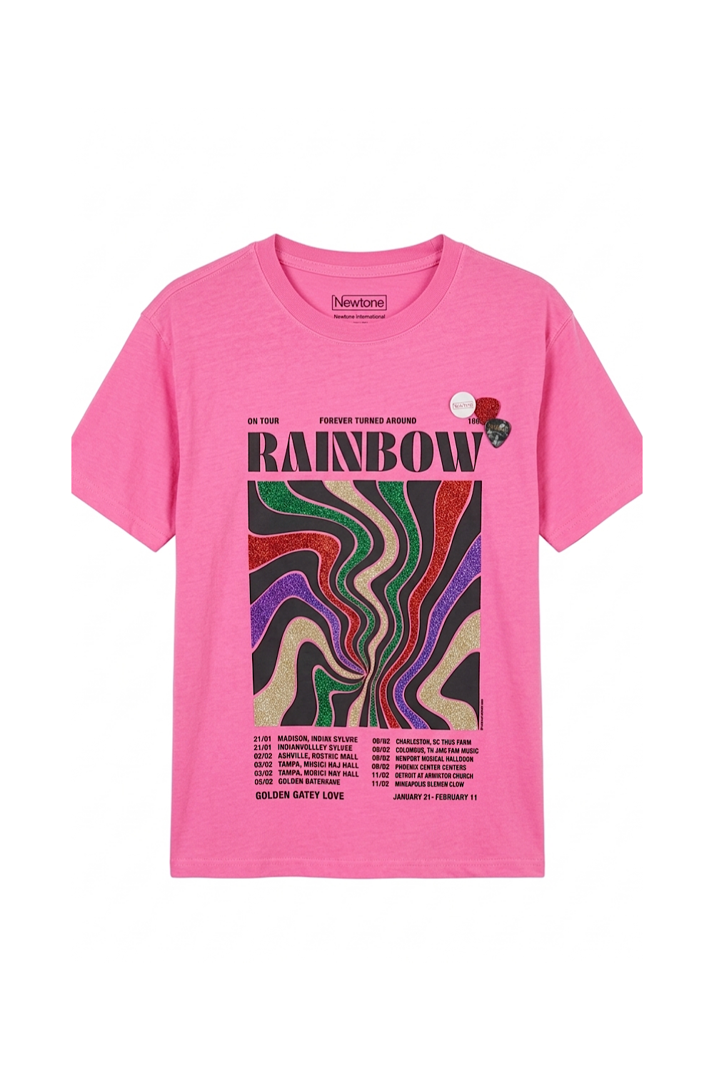 Col rond, manches courtes, imprimé avec couleurs en pailettes. Badges Newtone Brand.